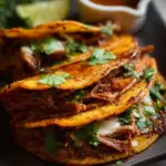 Birria tacos feature tender, stewed beef wrapped in corn tortillas. The dish originates from Jalisco, Mexico, and is often served with a flavorful broth known as consomé for dipping.