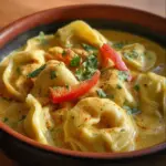 Cheese Tortellini in Curried Coconut Milk is a flavorful dish that combines cheese-filled pasta with a creamy, spiced coconut milk sauce enriched with curry powder and fresh vegetables.