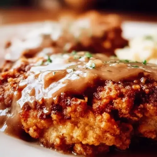 - Serve the crispy chicken fried steak topped with creamy gravy, garnished with chopped parsley.