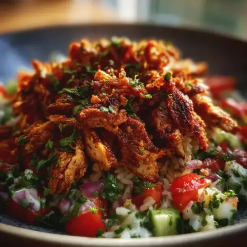This Chicken Shawarma Crispy Rice Salad stands out for several reasons. First, the fusion of spices in the chicken offers an exciting kick that elevates the dish. You get a balanced mix of savory and aromatic flavors, as the chicken marinates in a blend of spices that include cumin, paprika, and garlic. This is not just a meal; it’s an experience for the taste buds.