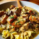 A delightful twist on classic beef stroganoff, featuring tender chicken, earthy mushrooms, and a rich creamy sauce, perfect for any occasion.