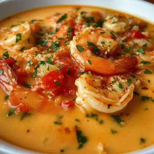 This luxurious crab and shrimp seafood bisque features a creamy texture and rich flavor, combining fresh seafood with aromatic ingredients for a delightful experience.