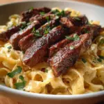 Creamy Butter Steak and Pasta is a sumptuous dish that combines seared strip steak with fettuccine pasta, all tossed in a rich, creamy sauce made with butter, cream cheese, and heavy cream.