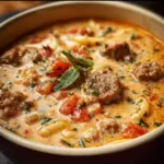 A comforting soup combining rich Italian sausage, creamy broth, fresh vegetables, and tender pasta, perfect for any meal.
