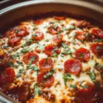 Crockpot Pizza Dip is a warm, cheesy dip that brings together key ingredients found in pizza, such as marinara sauce, cream cheese, mozzarella, and pepperoni, served with dippers like breadsticks or crackers.