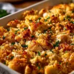 Dolly’s Chicken and Stuffing Casserole is a comforting dish made with shredded chicken, cream of chicken soup, sour cream, stuffing mix, and melted butter. It bakes into a warm, bubbling casserole perfect for family dinners or gatherings.