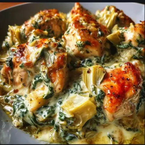 High-protein spinach and artichoke chicken casserole is a creamy, flavorful dish made with shredded chicken, spinach, artichoke hearts, and a blend of cheeses, offering a healthy dose of protein and nutrients.