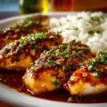 7. Serve: On serving plates, place your chicken breasts over a bed of rice or alongside steamed vegetables. Drizzle any remaining glaze from the skillet over the chicken for an extra touch of flavor.