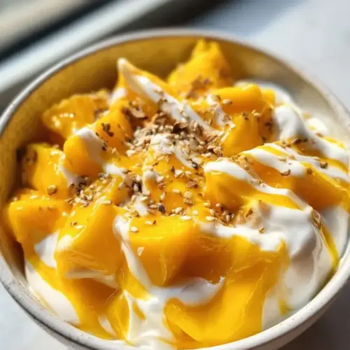 A refreshing and nutritious bowl combining creamy yogurt with fresh, sweet mango, perfect for breakfast or a light snack.