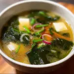 Miso soup is a traditional Japanese dish that has won the hearts of many around the globe for its simplicity and rich umami flavor. Its base, dashi, created with kombu and bonito flakes, serves as a flavorful foundation, while the addition of miso paste provides a comforting depth. It’s a heartwarming bowl that not only nourishes the body but also warms the soul, making it a staple in Japanese households and a favorite worldwide.