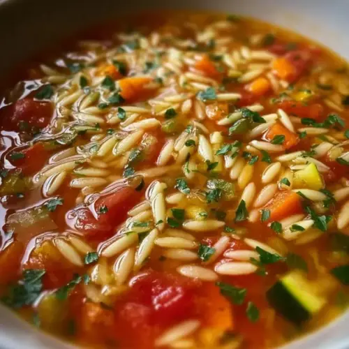 A hearty and nourishing Orzo Vegetable Soup made with orzo pasta and a variety of vibrant vegetables, simmered in flavorful vegetable broth.