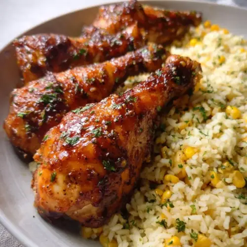 - Serve the chicken drumsticks alongside the fluffy rice and corn, garnishing with fresh parsley if desired.