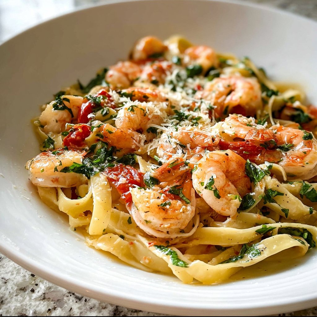 Sprinkle finely chopped parsley over the finished dish for a fresh and vibrant touch. You might also want to add a few cherry tomato halves on the side for a splash of color. Serve your shrimp fettuccine with crusty bread on the side; its delightful texture is perfect for dipping into any leftover sauce.