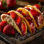 Strawberry Cheesecake Dessert Tacos are a playful and delicious dessert combining crispy tortilla shells filled with a creamy cheesecake mixture and topped with a vibrant strawberry sauce.
