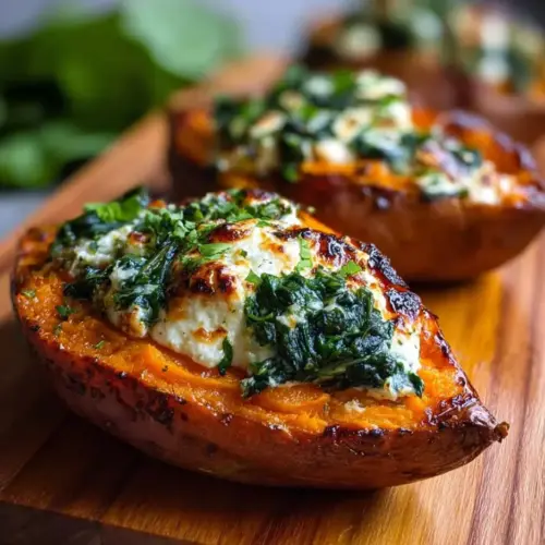 Experimenting with these stuffed sweet potatoes opens a world of flavor possibilities. One variation is to substitute the spinach for kale or Swiss chard; both options provide a different texture and taste while still being nutritious. For a Mediterranean twist, try adding sun-dried tomatoes, olives, or Feta cheese to the ricotta filling. If you prefer a different cheese, goat cheese or Greek yogurt can introduce tanginess and a lovely contrast to the sweetness of the potatoes. You can also add spices like cumin or paprika for a warm, earthy flavor. Other protein options, such as grilled chicken or chickpeas, can be mixed into the filling for added substance. Finally, consider topping the stuffed sweet potatoes with a drizzle of tahini or a light dressing before serving for an additional layer of flavor.
