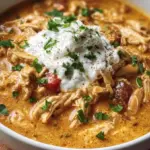 White Chicken Chili with Cream Cheese is a creamy and hearty dish made with chicken, cream cheese, and a variety of other ingredients like beans and corn. It’s typically cooked in a crockpot for an easy, flavorful meal.
